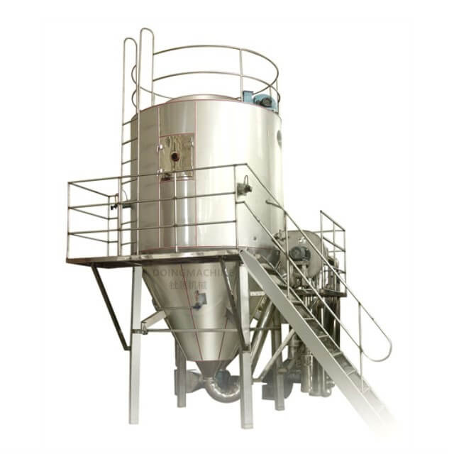 5) Size design of drying chamber: The size of drying chamber is specially designed to prevent droplets sticking to the inner wall, dried powder accumulating on the cone part and guarantee enough residence time.