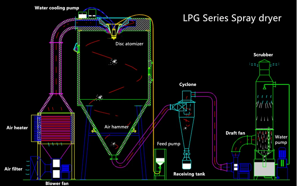 1. Drying liquid or slurry materials into dry powder 2. Atomizing type: centrifugal atomizer 3. Evaporation capacity: 5-100 kg/h 4. Heat source: steam, electricity, thermal oil or gas/oil/coal fired hot air generator